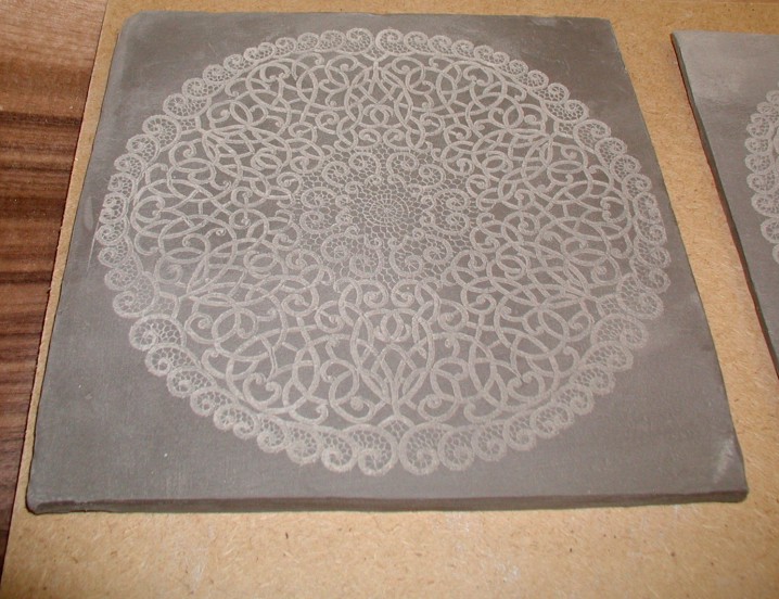 Laser Engraved Clay Engraved with an image of antique lace, this was an interesting experiment.The clay was still damp, and it did take a long time!